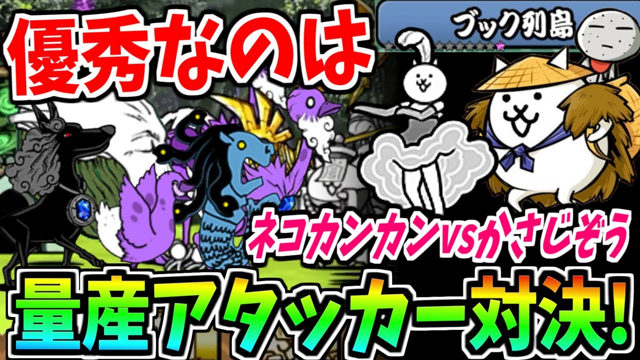にゃんこ大戦争最優秀量産アタッカー対決!ウルトラかさじぞうvsネコカンカン!!新ステージ『ブック列島』の攻略で新汎用編成を決める!!-にゃんこ大戦争【ブック列島】